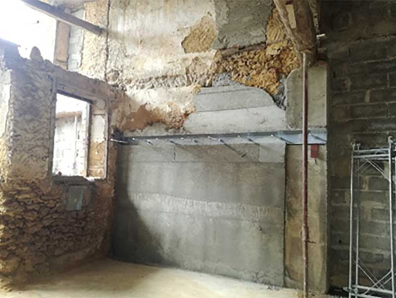 Figure 8 : utilisation d’un profilé métallique dans un mur fragile en moellons pour en reprendre la base au lieu de le démolir entièrement (les poteaux de part et d’autre existaient déjà). Le profilé nécessite des saignées de 8 cm de profond et de 22 cm de hauteur pour être installé. Il reste donc, une fois les profilés installés, 44 cm d’épaisseur de mur, ce qui est sécurisant. Le profilé une fois installé reprend la charge sous la voûte principale et lui sert de tirant.