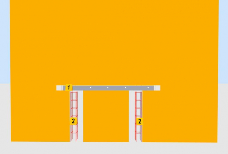 Figure 10 : Repère 1 : installation des profilés dans des saignées ; Repère 2 : ouverture poteaux et ferraillage.