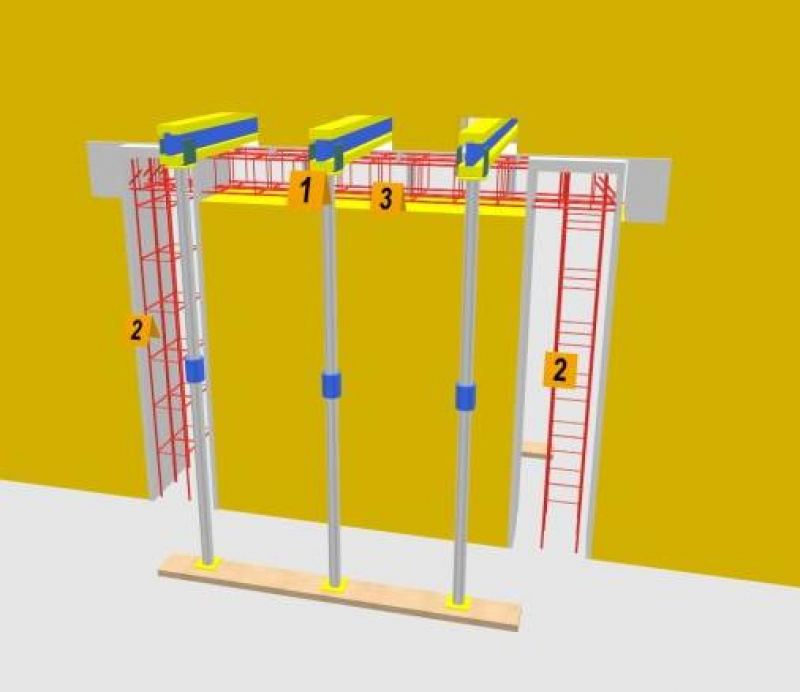 Figure 12 ; Repère 1 : réservation poutrelles et étaiement déporté ; Repère 2 : ouverture poteaux et ferraillage ; Repère 3 : ouverture poutre et ferraillage. Nota : il convient de vérifier la capacité portante des étais en fonction de leur déploiement