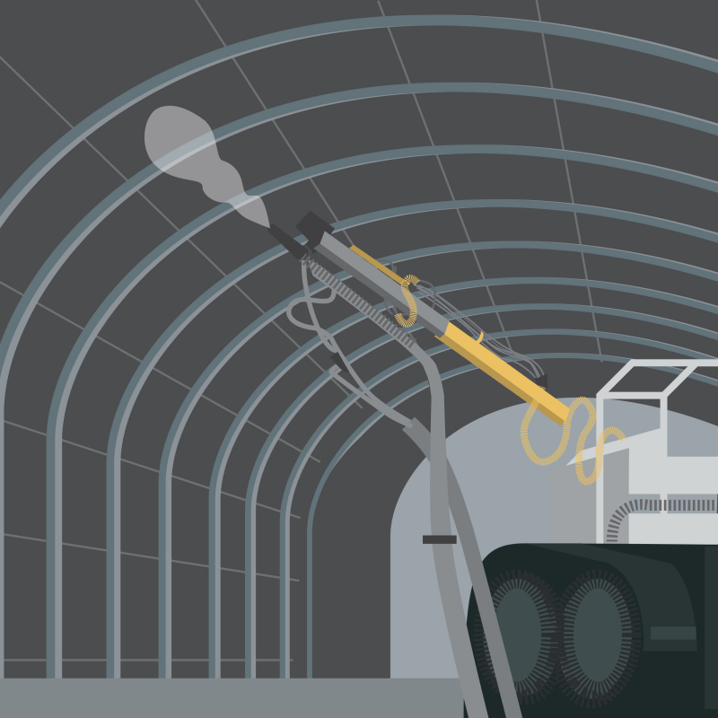 Le mélange ciment-agrégat est réalisé en surface, l’ajout de l’adjuvant en souterrain. On installera un système de dépoussiérage au niveau de la machine à projeter ou du tapis d’alimentation.
