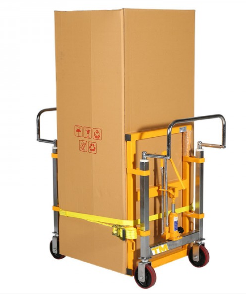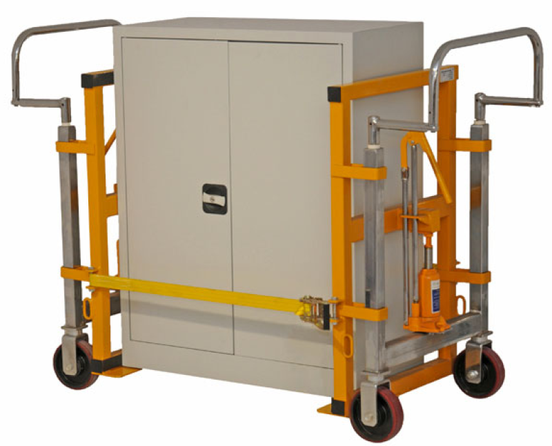 L'élévation de la charge s'effectue manuellement à l'aide d'une pompe hydraulique. En lien :
