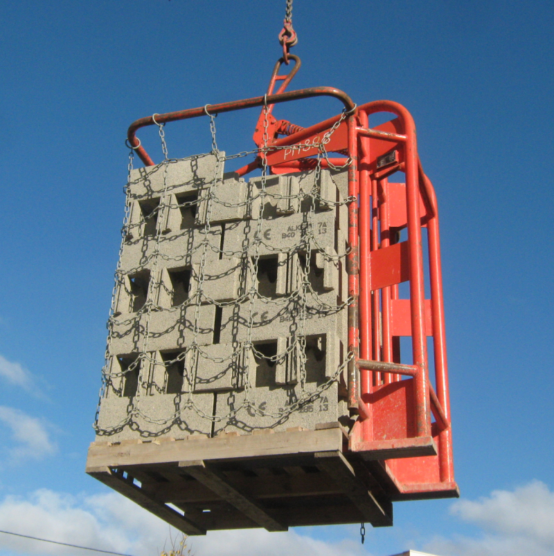 Utiliser une fourche lève-palettes. Proscrire les sangles, chaînes ou câbles passant à l’intérieur de la palette en bois. En cas de levage d’une palette déhoussée ou décerclée, équiper la fourche d’un protecteur de sécurité périphérique (suppression du risque de chute d’un entrevous pendant la manutention).