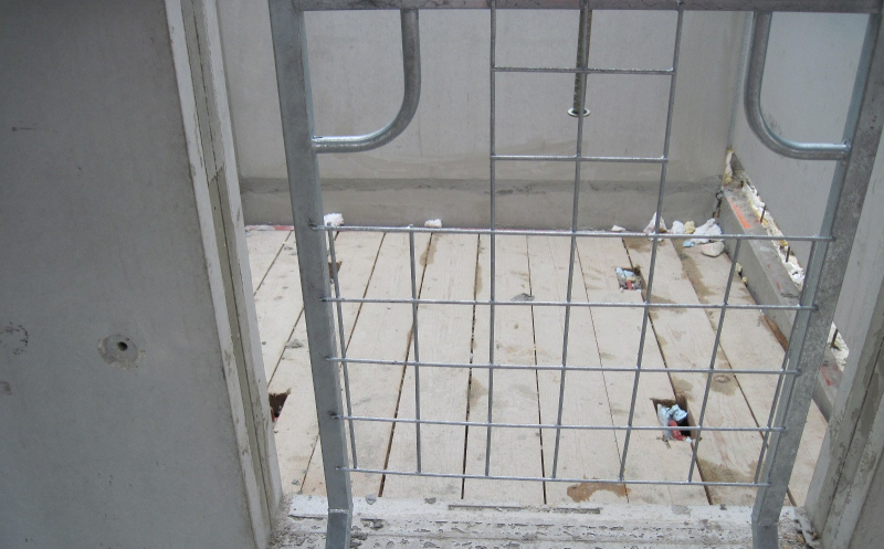 Podium sur tour d'étaiement Une solution courante consistait à mettre en place un panneau de treillis soudé ancré dans le béton de dalle sur ses quatre côtés, puis à le couper au moment du montage de l’ascenseur. Ce procédé a été la cause d’accidents très graves qui se sont produits au cours de différentes phases, mais surtout au moment de l’enlèvement des treillis.