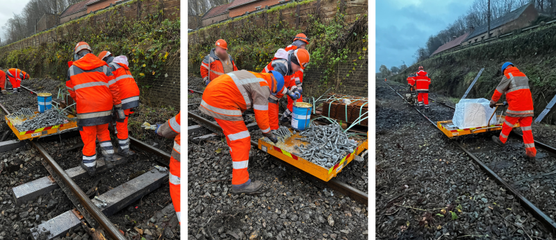 Déboulonnage des tirefonds. Les selles, tout comme les tirefonds, sont ramassées et ensuite déposées dans un big bag sur un chariot lorry que les compagnons poussent en marchant.