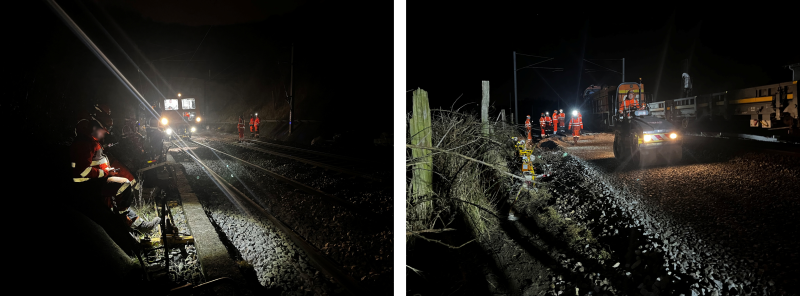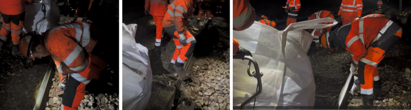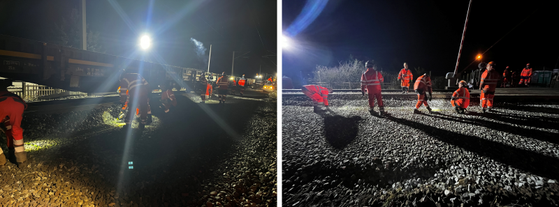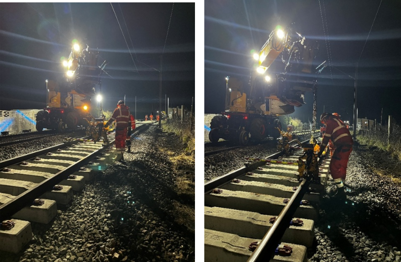 ● l’activité de renouvellement voie ballast (RVB) pour remplacer 108 m de rails et changer 180 traverses lors d’un chantier de nuit. Cela a nécessité la présence de trois pelles rail-route (engin utilisé couramment pour des travaux de terrassement, d’excavation permettant de déplacer de grandes quantités de matériaux rapidement) et d’une bourreuse.