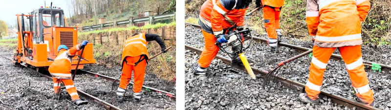 Bourreuse Les agents peuvent également tasser et aligner le ballast à l’aide de fourches et compacter le ballast avec un bourroir autonome thermique (comme sur le chantier ci-dessous).