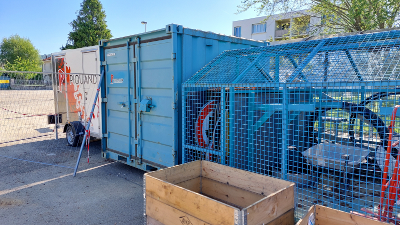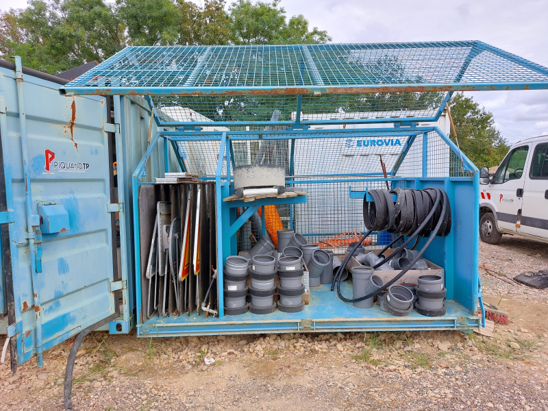 Une entreprise de travaux publics a mis au point un équipement sur berce composé d'un container et d'un espace grillagé pour y placer panneaux, raccords, brouettes, etc. Associé à un camion avec bras de levage, ce dispositif lui permet de réduire les manutentions pour ses opérateurs tout en améliorant son organisation de chantier.