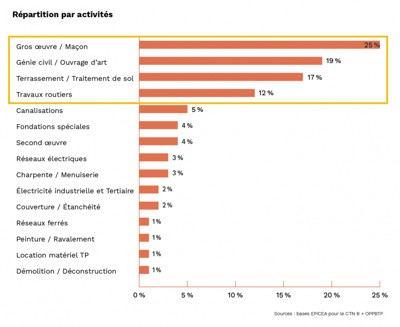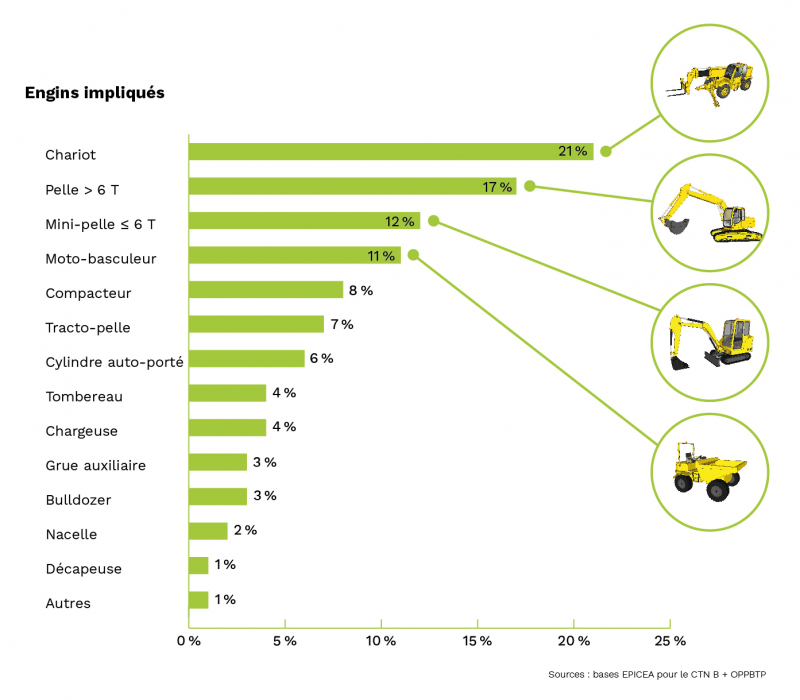 Quatre métiers concentrent plus de 70 % des accidents de renversement d’engins. Dans le bâtiment, il s’agit du gros œuvre et dans les travaux publics, le génie civil et les ouvrages d’art, le terrassement et les travaux routiers sont les principales activités exposées.