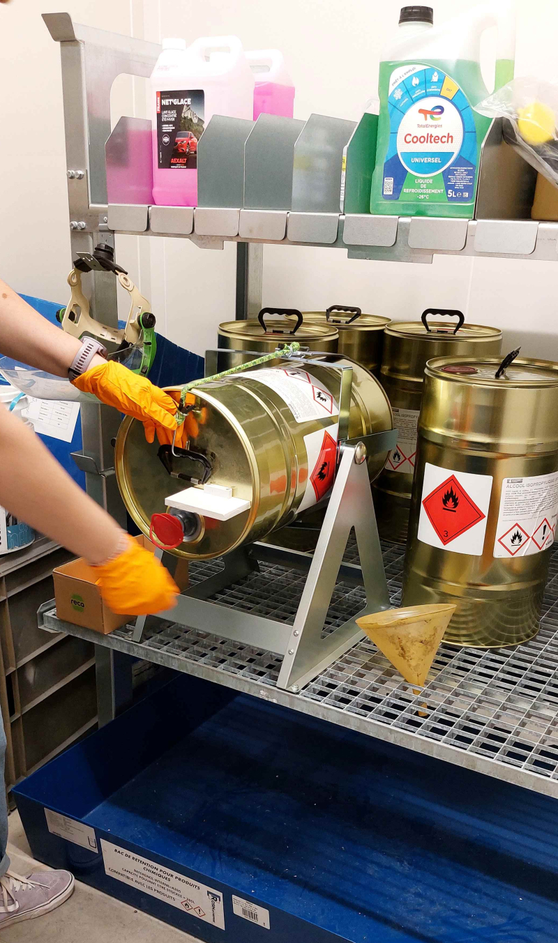Afin de réduire ces risques et dans le cadre de sa démarche de prévention concernant le risque chimique, la PME a mis à disposition de ses équipes un support porte-fût de marque Kongamek. Cet équipement basculant évite d'avoir à soulever ou incliner manuellement les contenants.