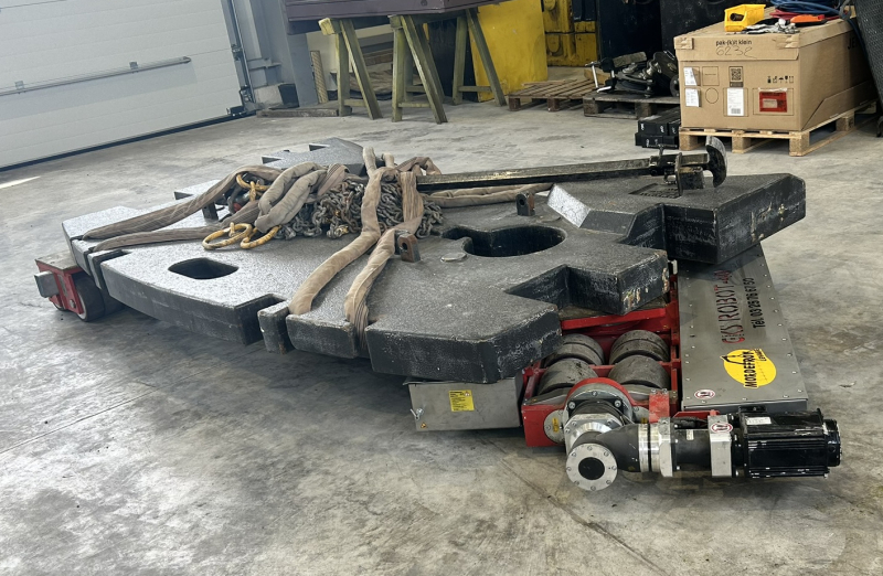 Associé à un cric hydraulique, ce dispositif permet de soulever la charge en toute sécurité afin d’installer des coussins d’air gonflés par compresseur, avant de les remplacer par les rolls motorisés du robot.