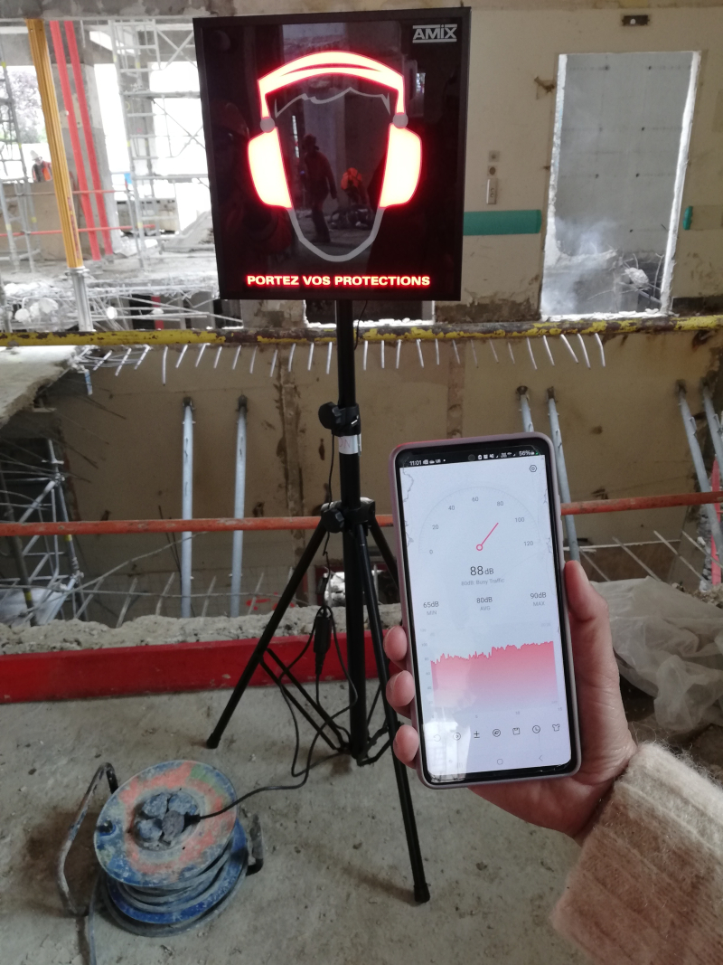 Sur un chantier de réhabilitation lourde, l’entreprise générale a installé un écran digital qui mesure et affiche en temps réel le niveau sonore. Ce dispositif indique clairement aux compagnons quand ils doivent obligatoirement porter leurs protections auditives.