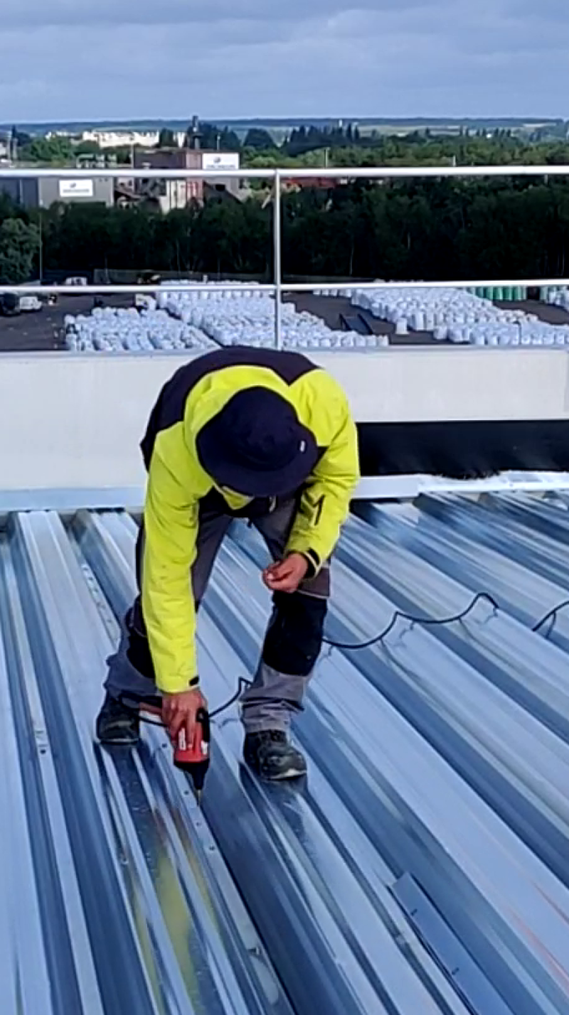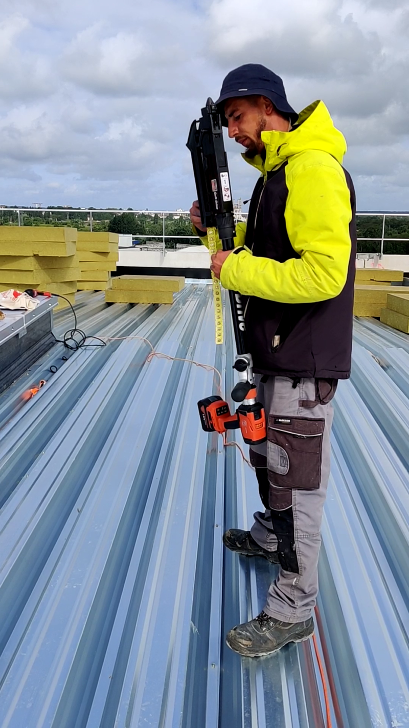 Une entreprise spécialisée dans les travaux d'étanchéité a investi dans un système Quik Drive. Cet accessoire évite d'avoir à se pencher lors du vissage et du couturage des tôles d'acier nervurées posées en couverture et destinées à recevoir un isolant et un système d'étanchéité.