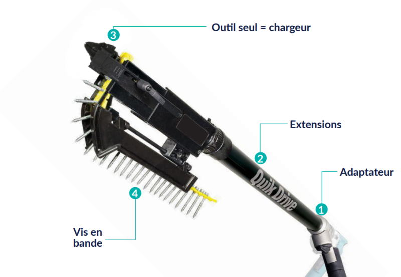 L'outil Quik Drive fabriqué par Etanco. Les adaptateurs existants permettent le montage sur les principales références de visseuses, filaires ou sur batterie, utilisées sur les chantiers. Etanco peut développer d'autres adaptateurs en fonction des besoins des clients.