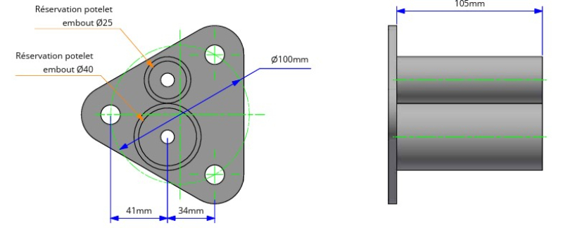 L'entreprise SDJ-BTP pratique la fixation des garde-corps par vissage pour assurer une protection collective de classe A selon la norme NF EN 13374. Afin de pouvoir s'adapter à des embouts de potelets d'un diamètre de 25 ou de 40 mm selon la disponibilité sur chantier et auprès du fournisseur, elle s'est équipée d'un support doté de deux diamètres de réservations. Ce modèle fabriqué par Retotub est compatible avec tous supports béton.