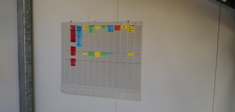 Pour s’assurer que l’ensemble du personnel a quitté le site en fin de journée, l’entreprise principale a installé un tableau de planning sur la base vie à l'entrée du chantier. Chaque colonne, de couleur différente, correspond à une entreprise et son personnel (intérimaires compris).
