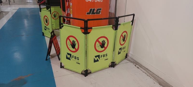 Ces barrières sont très légères et rapides à mettre en place puisqu'elles associent du PVC pour la structure, et une toile avec un symbole « Ne pas entrer ». Elles sont aussi personnalisables : l'entreprise a fait le choix d'y imprimer son logo. Cette personnalisation peut être intéressante lors de co-activités importantes pour identifier les entreprises intervenantes, ou en cas d'intervention dans une entreprise tierce.