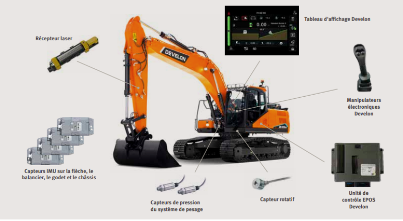 Le système de guidage de la machine utilise des capteurs installés sur l’équipement de fouille et sur la carrosserie afin de reconnaître la position en temps réel de chaque dispositif de travail, et guider le conducteur afin qu’il atteigne la cible définie. Le système de commande permet d'ajuster le fonctionnement du groupe de travail pour effectuer la tâche comme prévu.