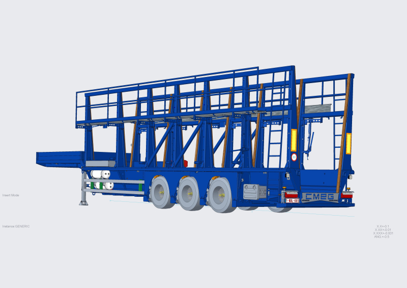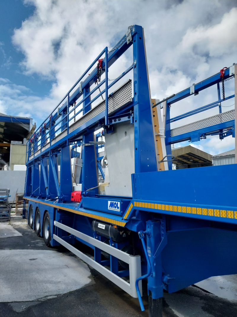 Dotée de trois essieux, la remorque porte panneaux préfabriqués fabriquée par Mol Cy peut accueillir tous types de panneaux de grande hauteur grâce à un espace de chargement très large et très bas.
