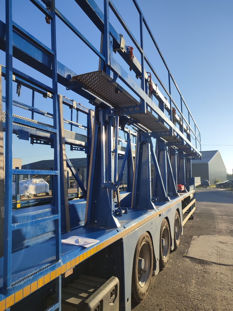 Le plateau, d'une longueur de 13,5 m, supporte une charge utile élevée. Son plancher incurvé facilite la mise en place des panneaux préfabriqués BA. La passerelle et les plateaux d'accès pour l'arrimage en hauteur se déploient depuis le sol.